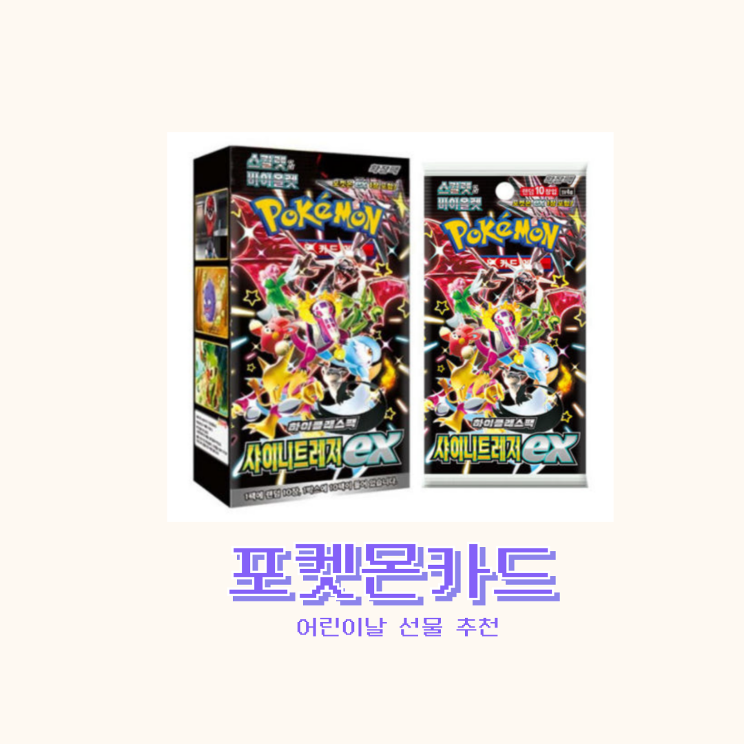 포켓몬을 좋아하는 아이라면 이 만한 선물도 없습니다. 바로 포켓몬 카드 한 박스인데요. 가격대가 좀 나가더라도 샤이니트레져를 추천드립니다. 이 패키지는 아이들이 좋아하는 소위 센 카드가 많아요. 그래서 버려지는 카드도 적고 일단 아이의 만족도가 높습니다. 엄마 마음엔 진짜 마음에 안 드는 선물이지만 아이의 환한 미소를 볼 수 있답니다. 가격대는 약 5만 원대입니다 😢