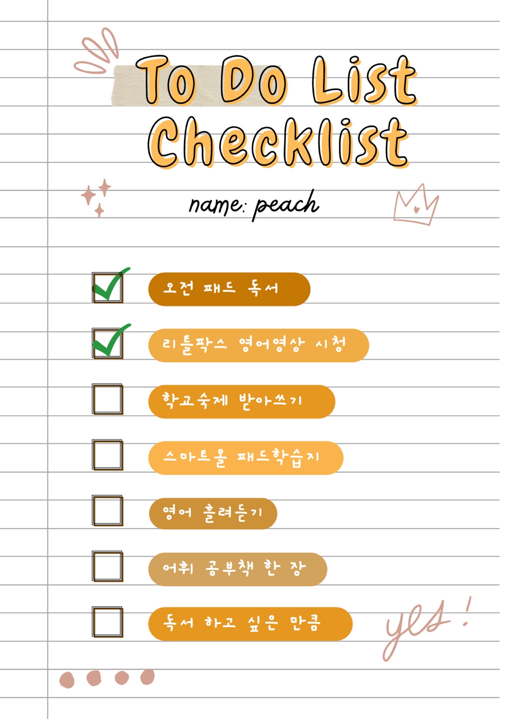 위의 체크리스트에 초록색으로 체크 된 두 가지가 늘 바뀌지않는 평일 모닝 루틴입니다. 그 후의 리스트는 그 날 그 날 조금씩 바뀌어 예시로 적당히 작성해 보았습니다. 보통 스마트올 패드학습과 영어 흘려듣기(5분)는 평일에 늘 하는 학습입니다. 패드학습은 요일 마다 과목 스케쥴이 다른데, 과목이 두 과목 이상일 때는 아이가 순서를 정해서 스스로 공부합니다.