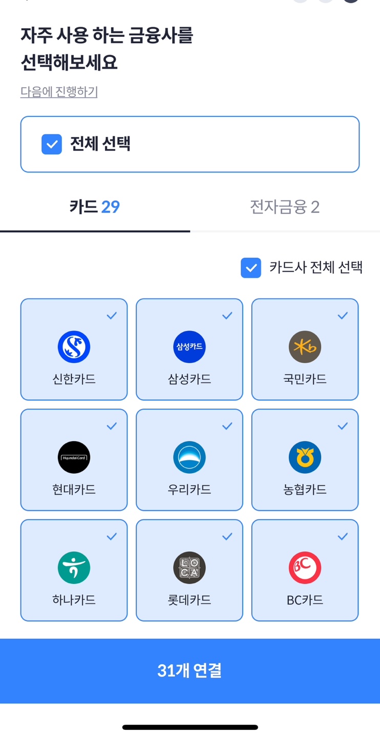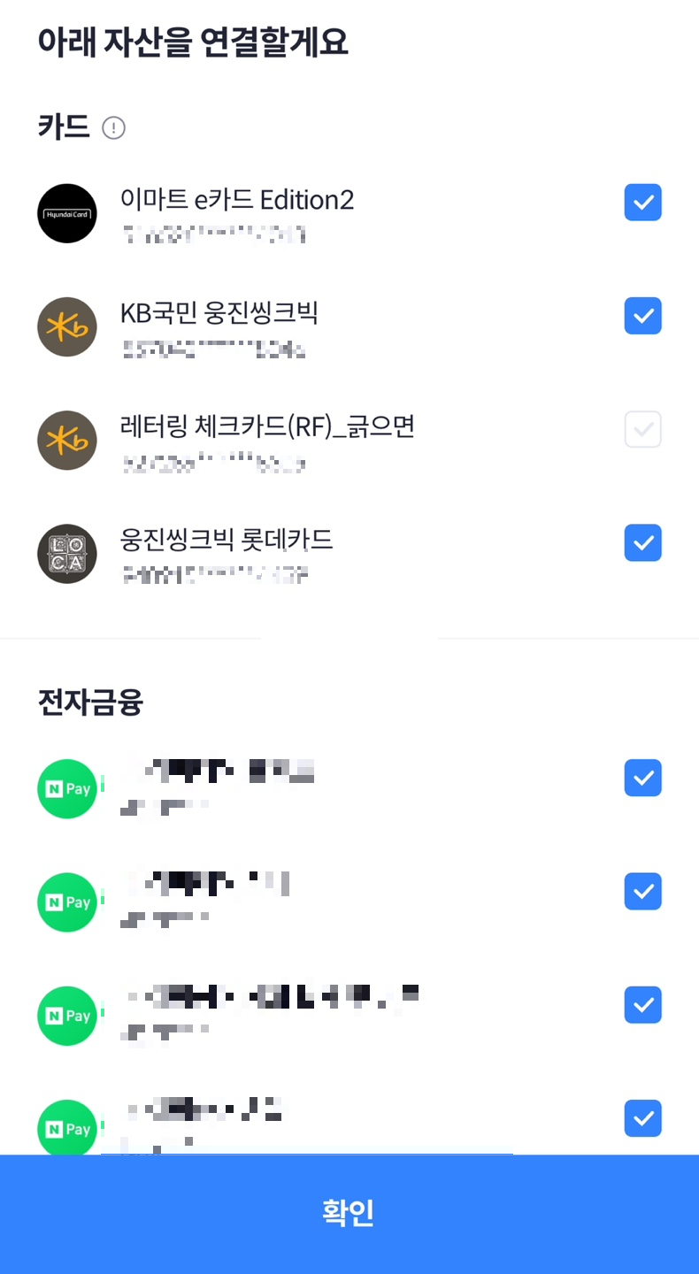 연결하지 않을 카드나 자산은 이름 옆에 있는 체크박스에 체크를 해제시키면 연결되지 않습니다.