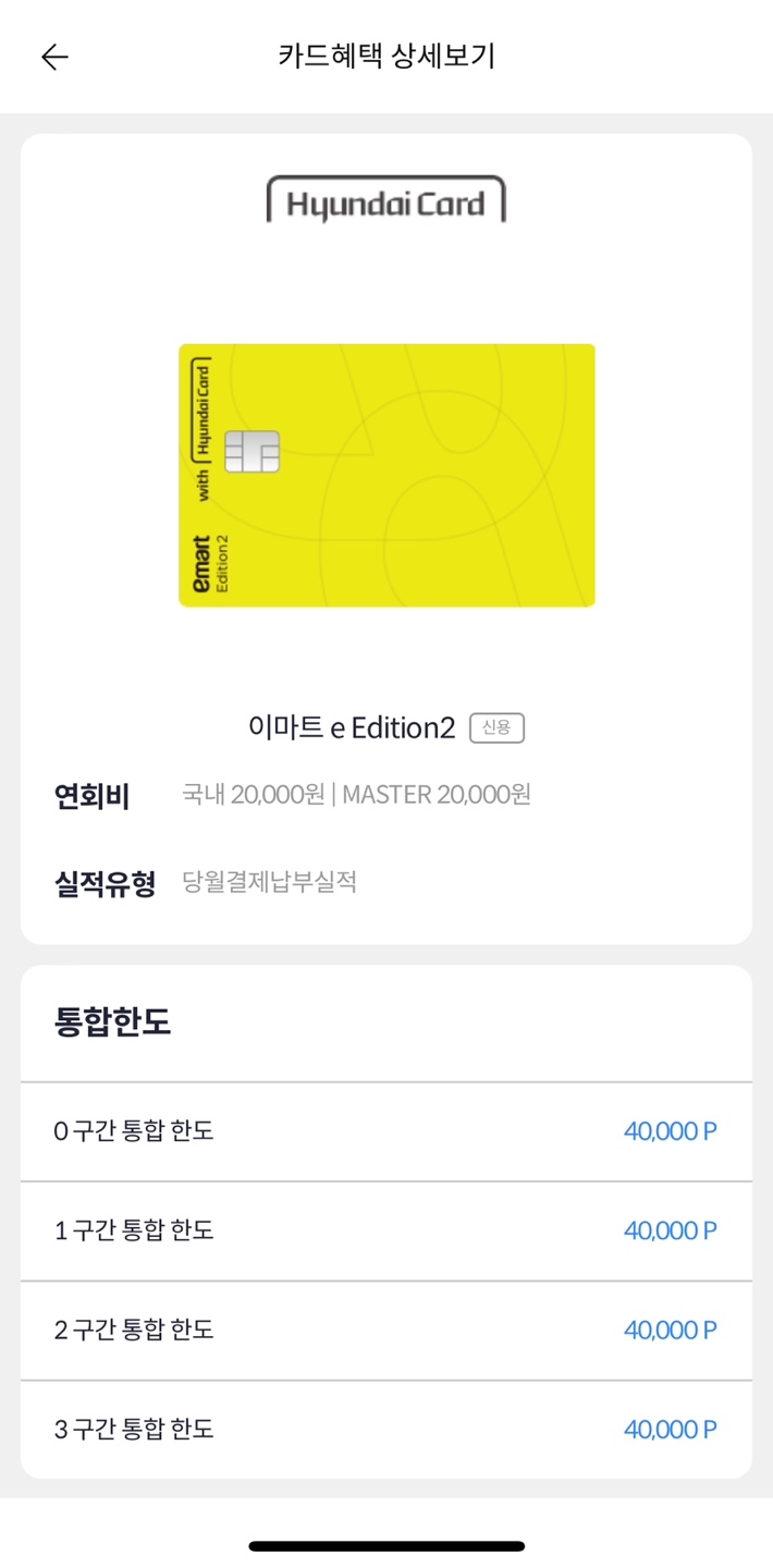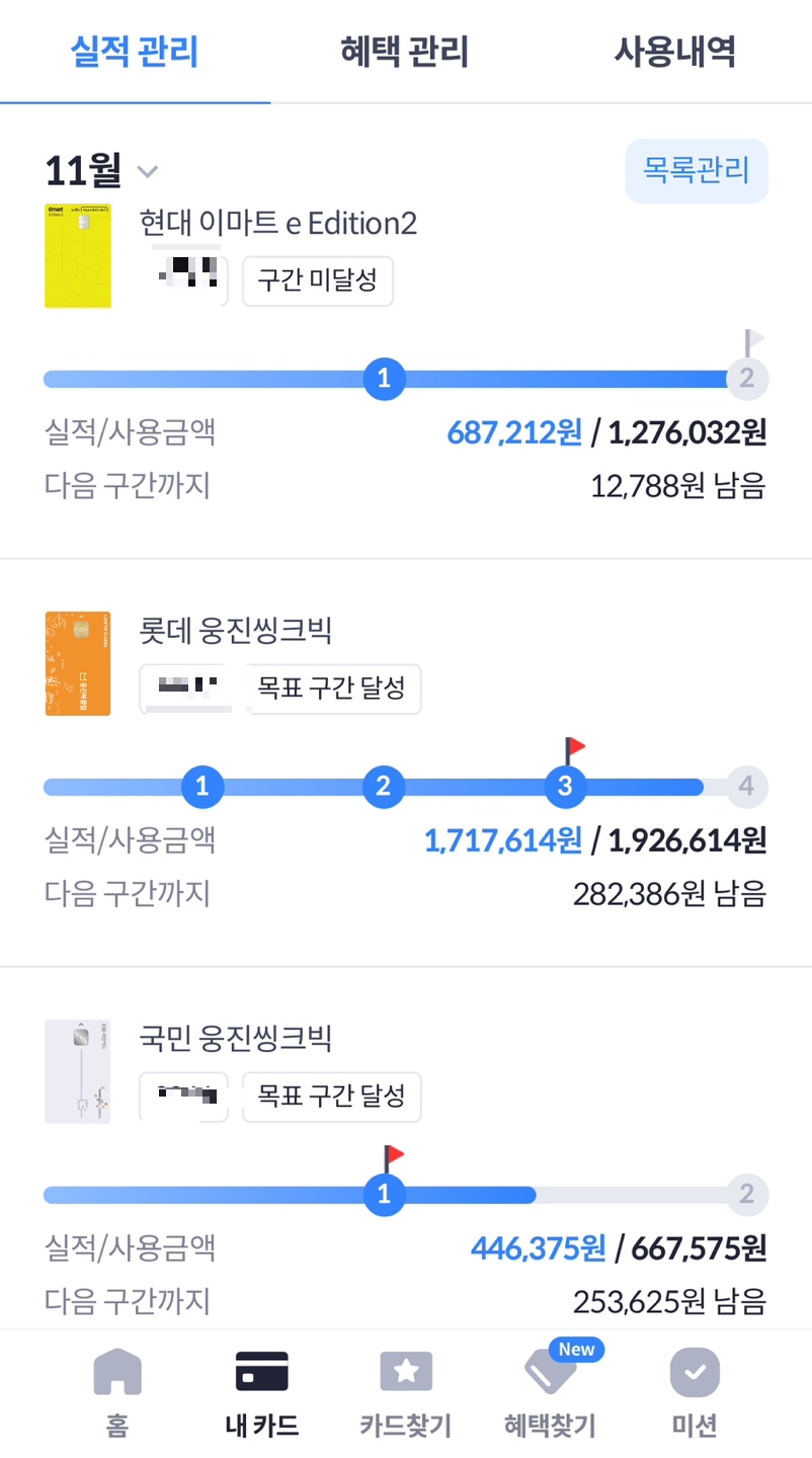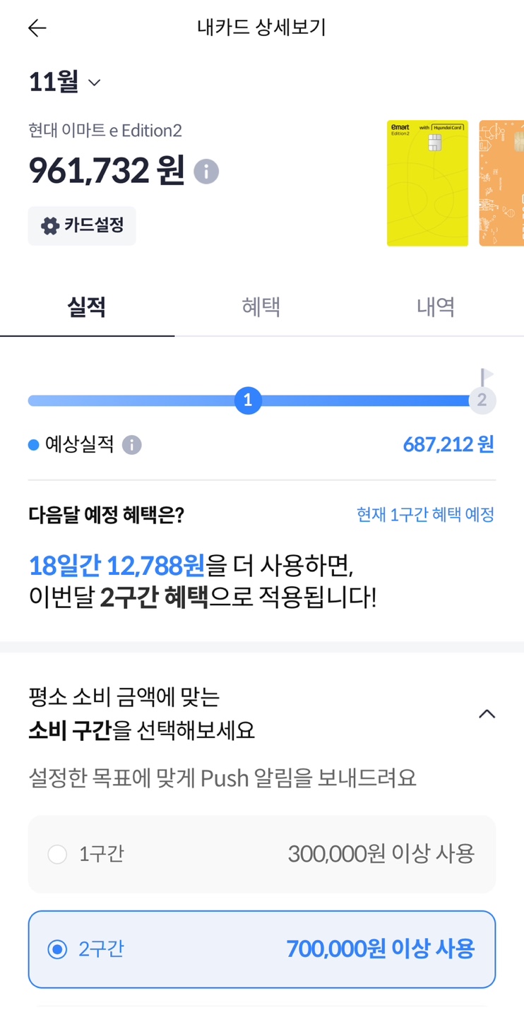 그러나 가장 상단에 현대 이마트 카드는 아직 '구간 미달성'이네요.