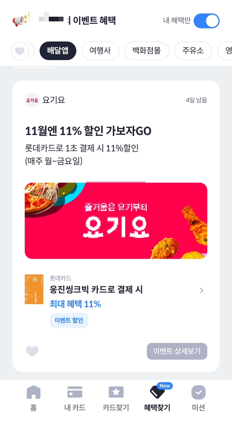 저는 어제 배달 앱을 사용할 일이 있어서 내 혜택을 검색해 봤더니 마침 '요기요' 11% 할인이 있어서 '더쎈카드에서 추천하는' 롯데카드로 결제하고 할인 혜택을 받았습니다.