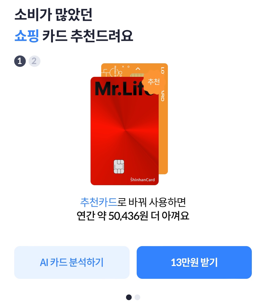 AI 추천 결과로는 웅진씽크빅 롯데카드를 신한카드 MR.Life로 바꾸라는 결과가 나왔습니다.
