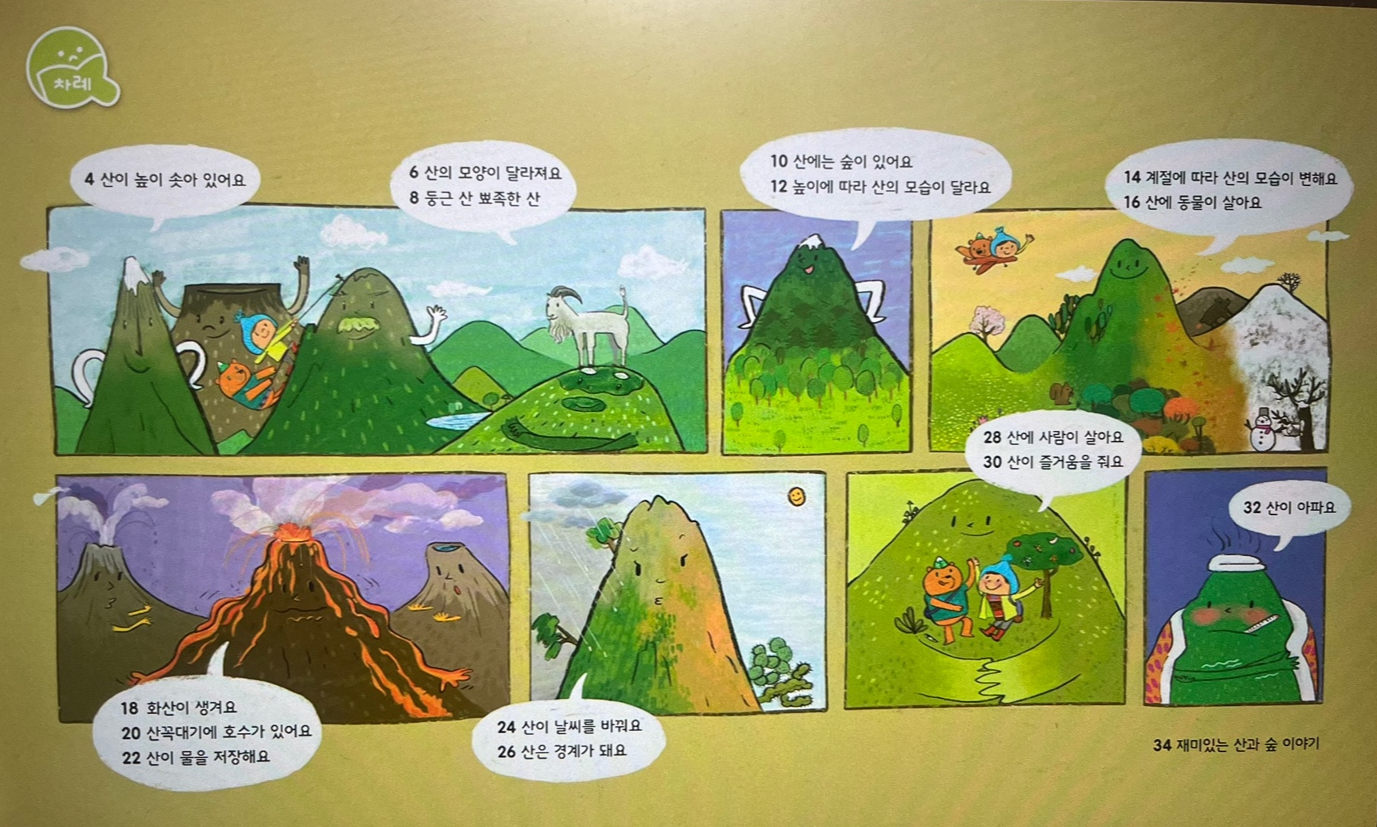 높고 깊은 산과 숲은 '웅진 호기심 백과 큐' 전집 중 한 권입니다. 유아들이 보는 백과라 쉽지만 어쨌든 백과이기 때문에 차례가 주제 별로 나눠져 있습니다.