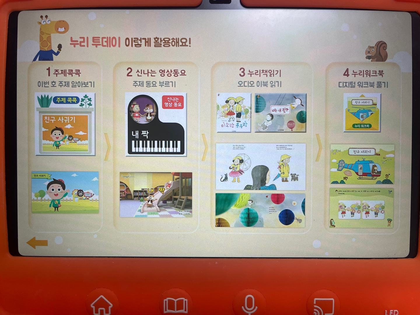 아이가 웅진북클럽을 하게 되면서 이제 '누리 투데이' 카테고리에서 누리과정 연계도서를 편하게 읽을 수 있어 참 도움이 됩니다. 또한 누리 워크북이 매주 제공되어 읽었던 책의 내용을 독후 활동과 독후 퀴즈의 형태로 다시 한번 머릿속에 꼭꼭 넣을 수 있어서 마음에 드네요.