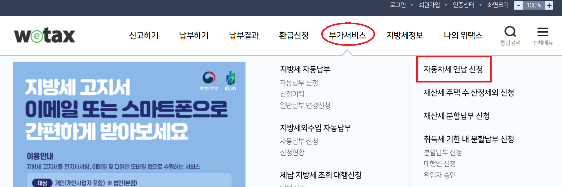 2. 로그인 후 메인화면에서 '부가서비스> 자동차세 연납 신청'을 클릭해 주세요.