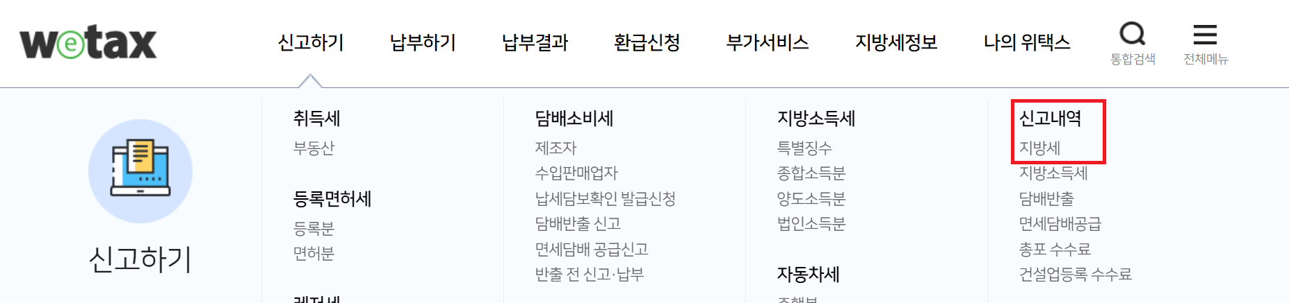 신고하기 > 신고내역 > 지방세를 클릭해 주세요.