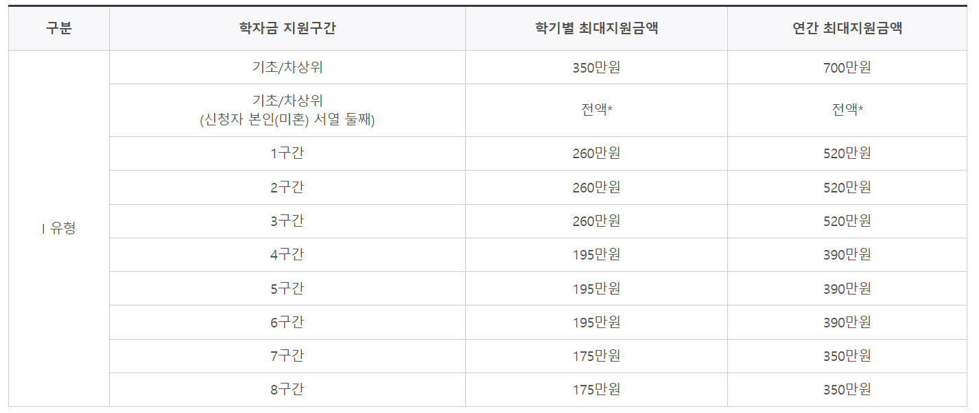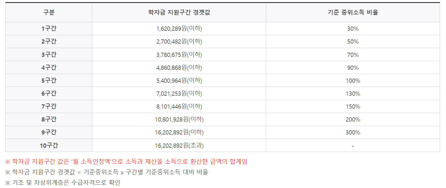 여기서 '학자금 지원 구간'이라는 말이 생소하실수도 있는데요, 쉽게 말해 소득, 재산을 환산한 월 소득인정액을 말합니다. 보통 복지 정책에서 자주 등장하는 '중위소득'과 유사한 개념입니다.