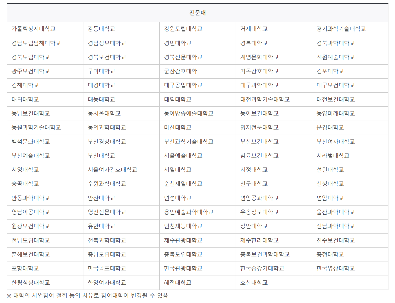 - 국가장학금 2유형 지원 대학 리스트(2년제)