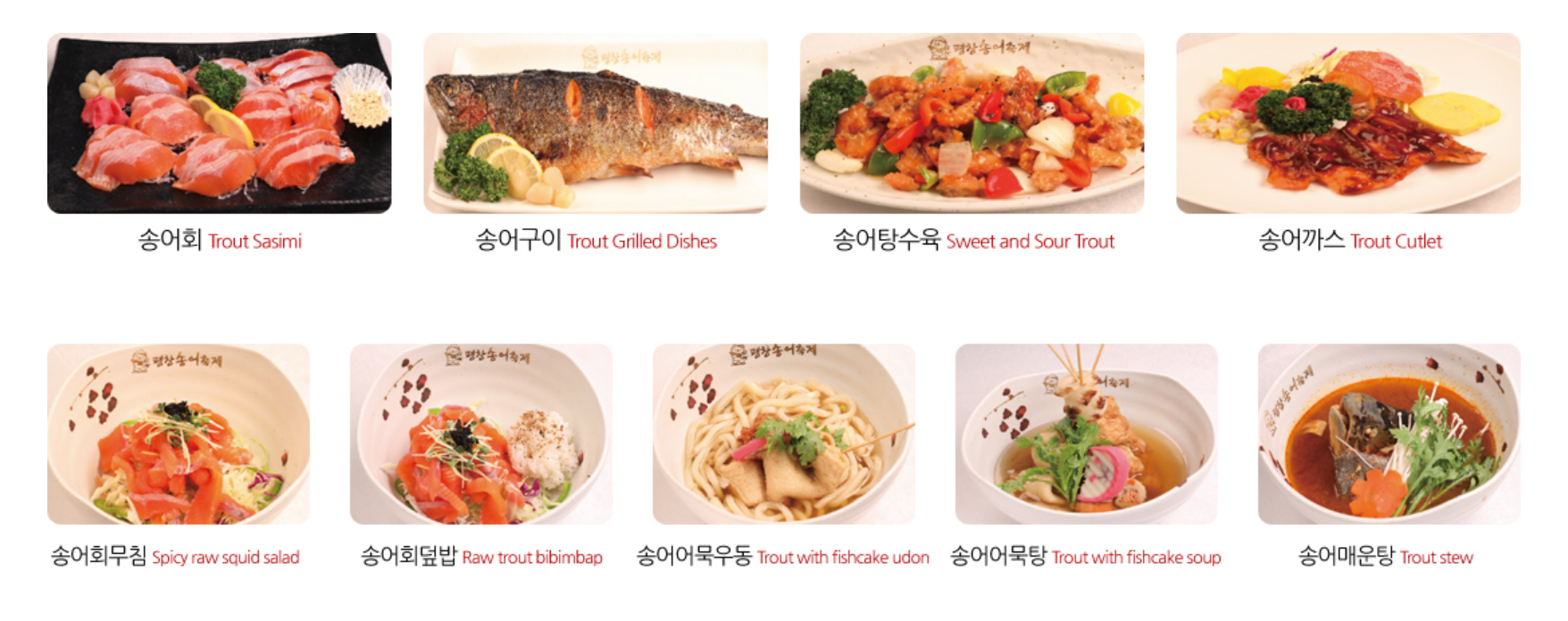 이건 사진으로 보시는 게 좋을 것 같습니다. 각양각색의 질 좋은 송어 요리가 준비되어 있습니다. 먹거리 걱정은 안 하셔도 되겠죠?