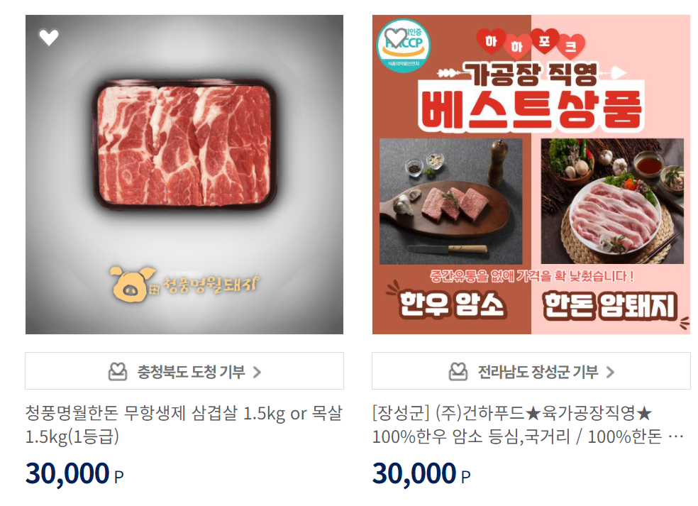 무항생제 한돈도 3만원에 판매되고 있는 상품들이 보입니다.
