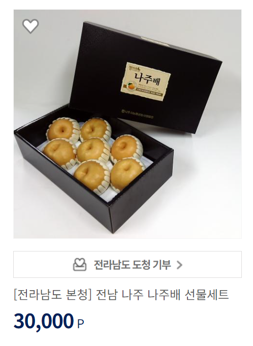 천안과 나주가 배가 맛있기로 유명한데요. 아직 선택할 수 있습니다. 3만원짜리 배 박스가 여럿 보이니 답례품몰에 '배' 검색하신 후 맛있는 배 구매하세요.