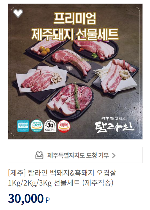 제주 흑돼지도 특산품 목록에 있지만 가격 선택을 할 때 보니 만 원이 추가되어 3만 원을 넘어갑니다. 제주 백돼지의 경우 3만 원에 구입 가능합니다.