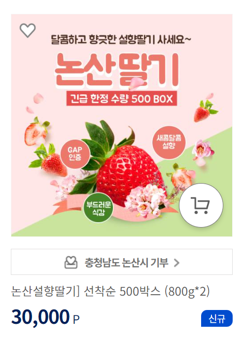 이번에 신규로 입고된 '논산딸기'를 500박스 한정으로 제공하고 있습니다. 딸기가 맛있는 철인데다가 딸기가 맛있기로 유명한 '논산'이라면 안 살 이유가 없겠네요.