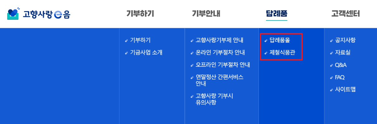 고향사랑기부제 고향사랑e음 홈페이지 카테고리를 살펴보면 각 지역의 답례품들 중 제철식품만 따로 모아 '제철식품관' 카테고리로 구성해 두었습니다. 답례품몰 바로 아래 카테고리입니다.
