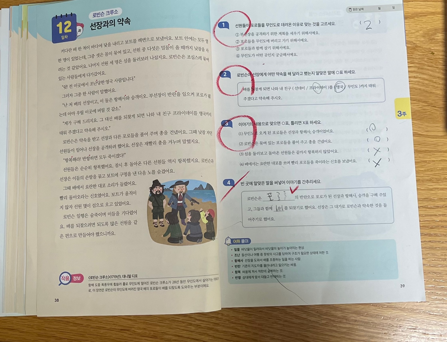 1학년 때부터 읽기 문제가 있어서 어려움을 겪다가 이제 또래 중간 수준, 혹은 중하 수준정도 된 것 같습니다. 만점왕 2학기 문제집을 다 풀고 방학 직전부터 새롭게 1일 1독해 하이라이트로 읽는 고전50을 풀고 있습니다.
