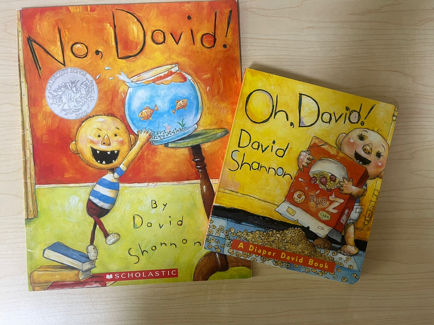 잠수네에서 해석을 하지 말고 읽어주라고 했기 때문에 웬만하면 해석 없이 읽어주었고, 매우 쉬운 그림책 위주로 읽어주었습니다. 예를 들면 'No David시리즈', 노부영 베스트 등 쉽고 재미있는 그림책들을 많이 읽었죠. No, David 시리즈는 아직도 좋아합니다 :)