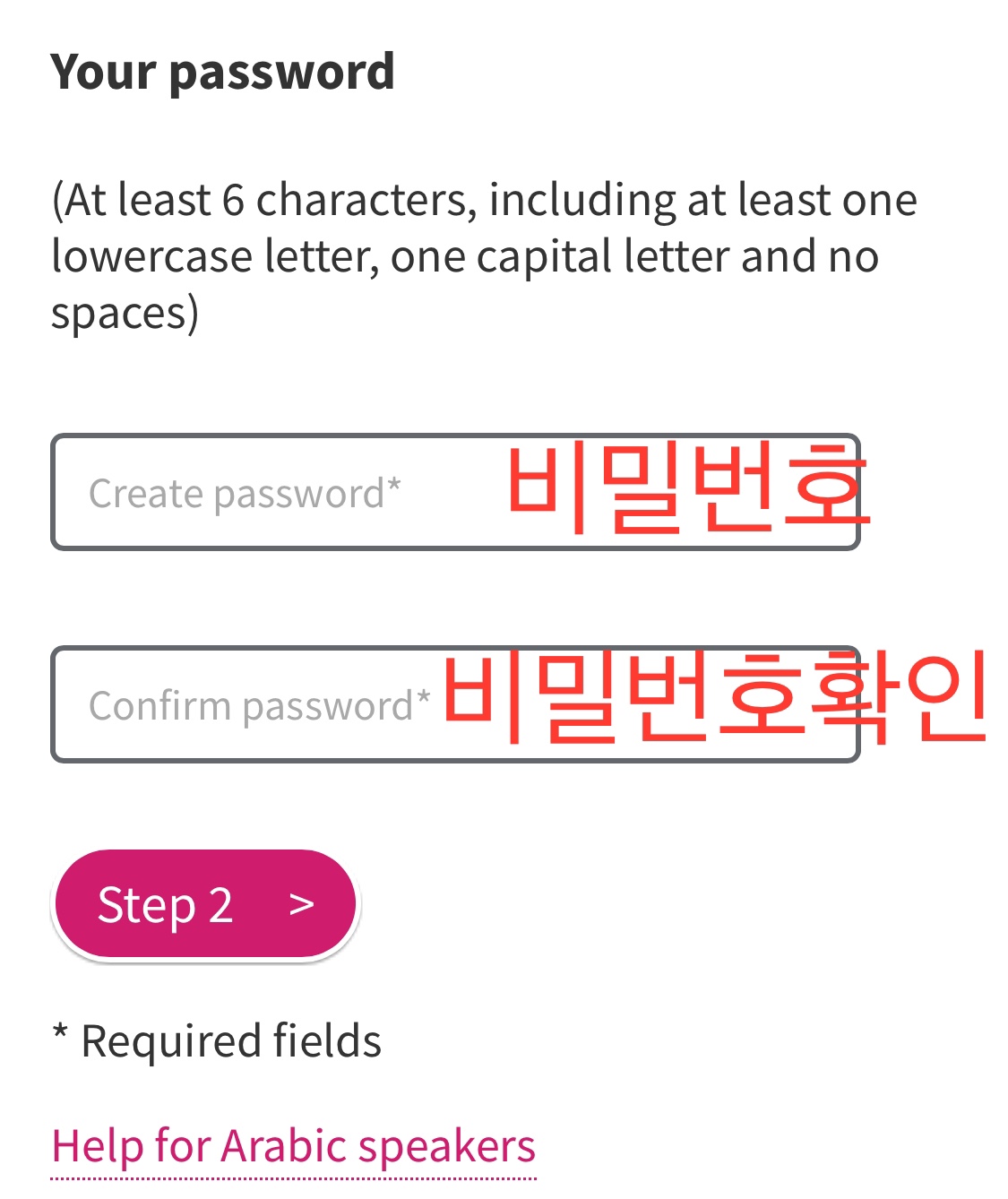 4) 비밀번호를 설정해 주세요. 비밀번호 확인 후 아래의 Step2버튼을 눌러주세요.